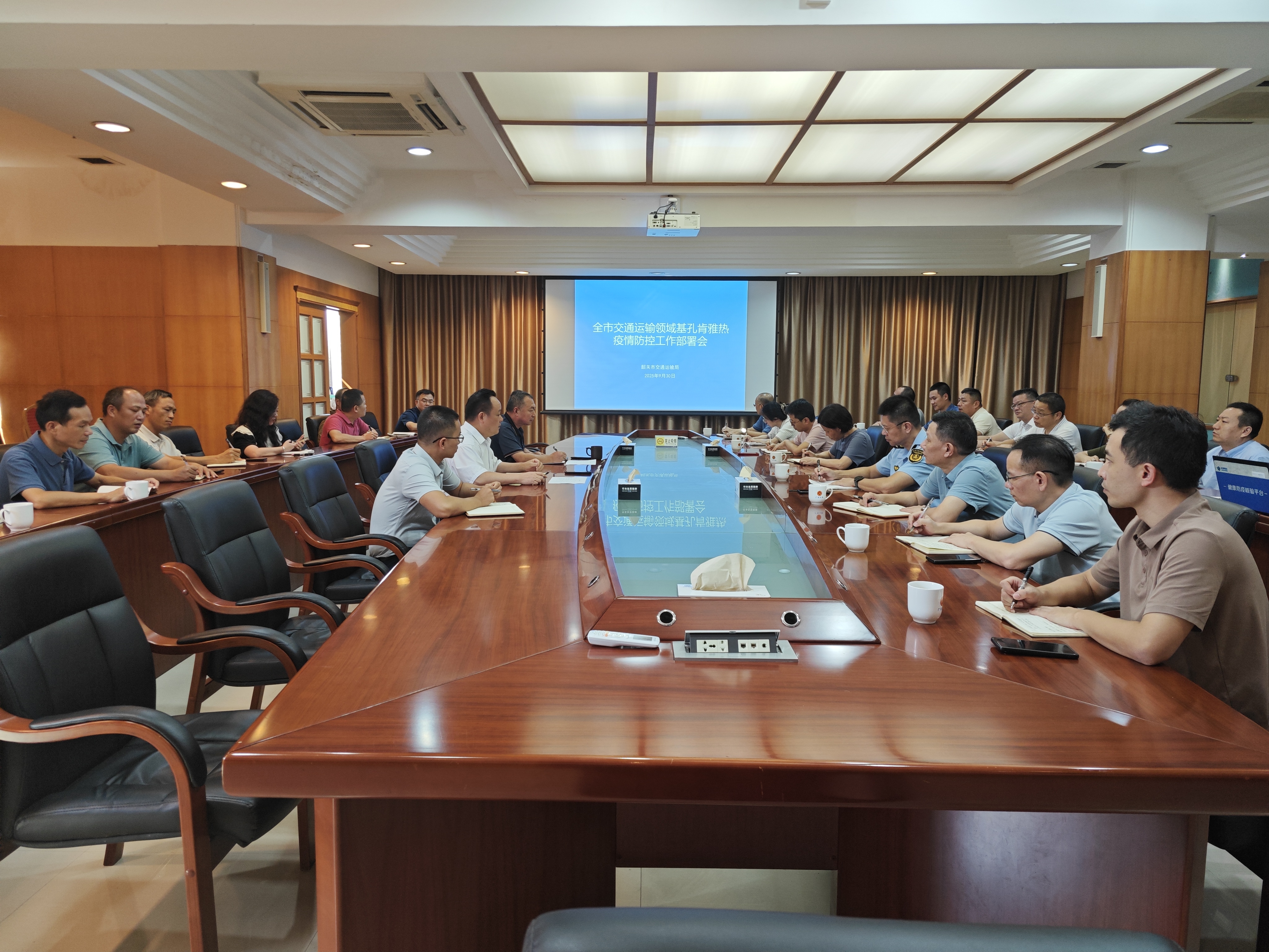 为全面筑牢基孔肯雅热防控屏障,9月30日下午,市交通运输局主要领导主持召开全市交通运输领域基孔肯雅热疫情防控工作部署会,传达学习省、市有关工作会议精神及市委主要领导指示精神,并对全市交通运输领域疫情防控重点工作进行了再强调、再部署。全市高速公路运营管理单位,市公路事务中心、市交通运输事务中心、局有关业务科室参加会议。