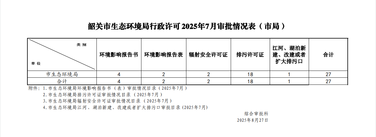 韶关市生态环境局行政许可2025年7月业务审批情况表