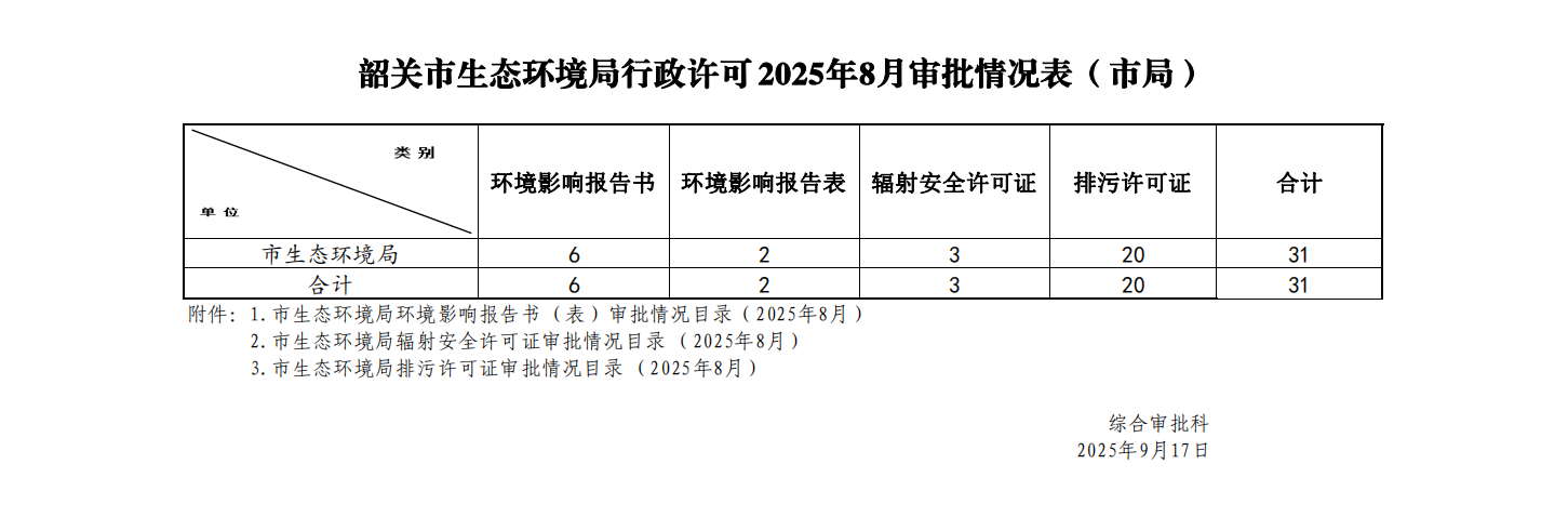 韶关市生态环境局行政许可2025年8月业务审批情况表